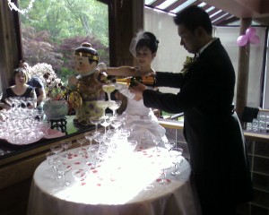 After the ceremony, they did the pouring champagne pyramid thingy, bouquet/garter belt throwing, and finally the cake cutting. I found it a bit weird that the cake cutting occurred at this point of the wedding as I would’ve expected it to occur near the end of dinner and the cake itself was dessert.