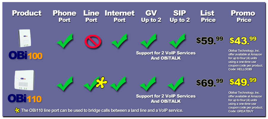 From the chart, it looks like the only difference is the Obi110 has an additional line port which allows you to do some neat stuff if you have an actual land line (e.g. calling from a phone outside your home and making calls through VoIP from your home internet connection). The Obi100 at the time of posting is available for $44 (after coupon / limit 4).