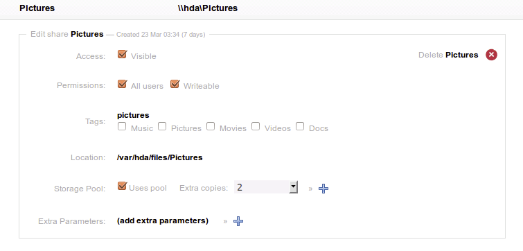 As you can see, I enabled this specific share to use the pool and to have 2 extra copies (so a total of 3 copies of each file on 3 separate drives). The # of extra copies you can set ranges from 0 to max (# of drives in your pool).