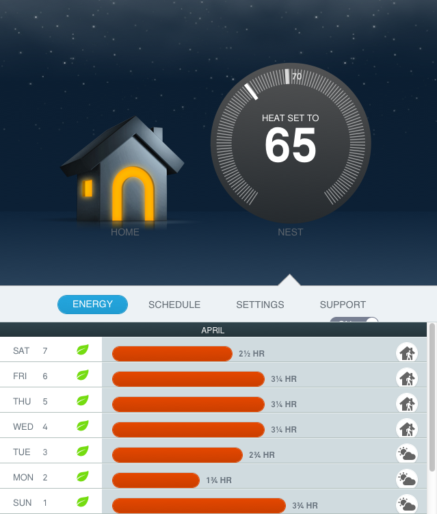 So I’ve had the Nest for a month and it’s been pretty cool so far (no pun intended). The auto-learn feature is pretty neat as it was able to guess my schedule pretty closely after the 1st week. I did end up tinkering with the schedule a bit, but it’s still learning.
